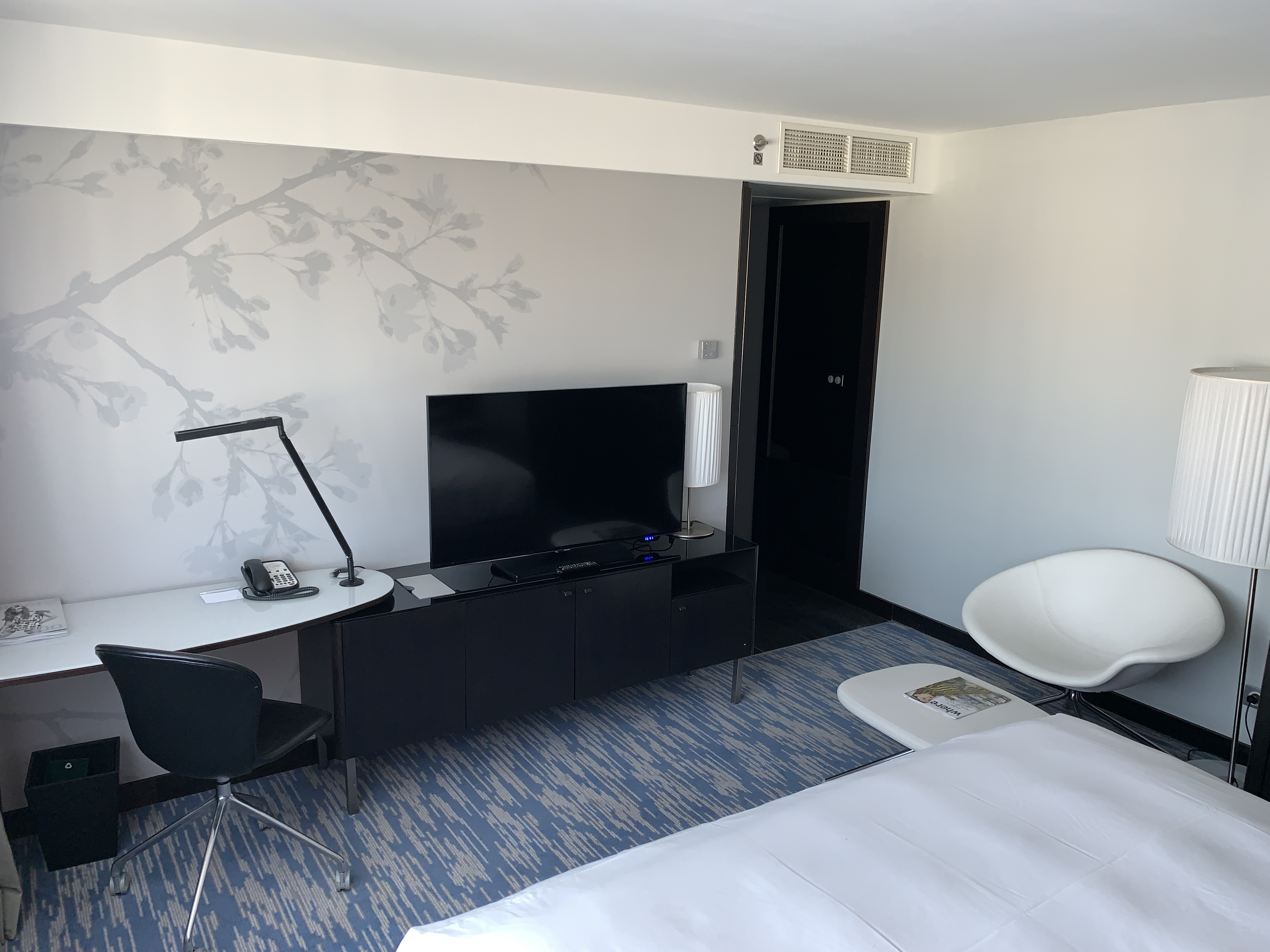 Dining options include a modern French restaurant and an intimate cocktail bar, complemented by revolving art exhibitions. Additional amenities include a terrace and a fitness center.