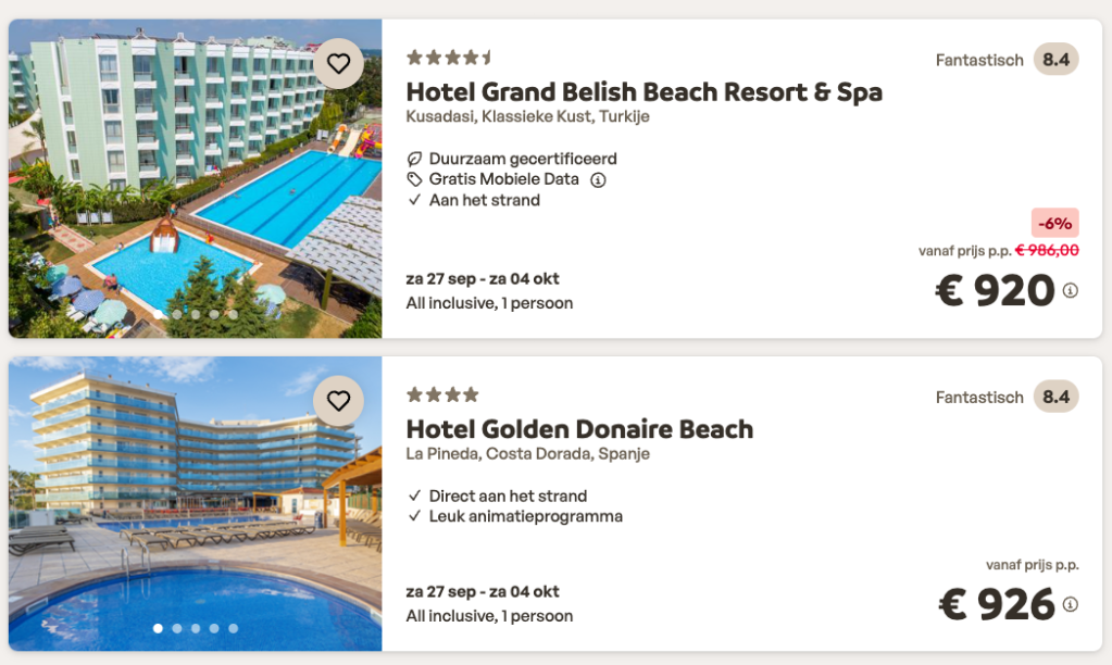 I searched for one-week holiday packages under €1,000, including flights and all-inclusive accommodation. I decided to book with Sunweb again, as they appear to be the most competitively priced tour operator for all-inclusive holidays departing from Brussels.
